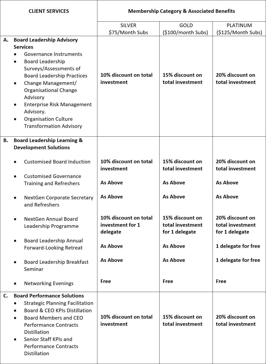 - Membership falls in the following three (3) categories: Silver, Gold and Platinum.